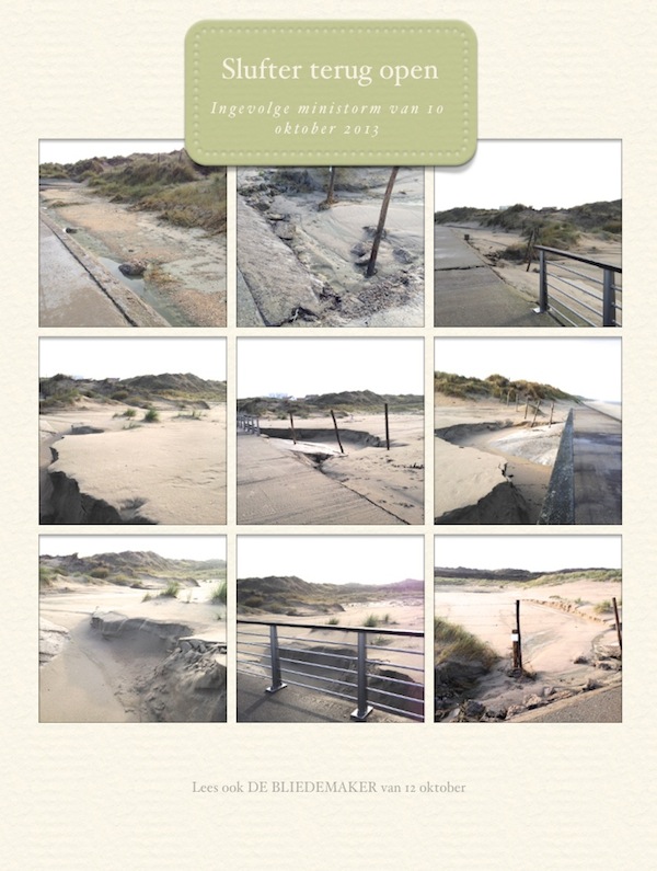 – Ingevolge de ministorm van verleden donderdag heeft de zee terug zijn weg gevonden naar de oostelijke slufter. De eerste duinpanne staat onder zeewater. De zee heeft een doorgang onder de brug uitgespoeld maar ook veel zeewater heeft zijn weg naar de duinen gevonden door overslag over de dijk. Dat is hetgeen Noël Hoste reeds lang voorspeld heeft. Zijn voorgestelde aanpassingswerken zijn nog niet gebeurd. Gelukkig is de schade nu beperkt.Maar wat bij een serieuze storm van 1 à 2 dagen? Lees meerdere artikels in de de WIKI van DepanneBlogt>>>>