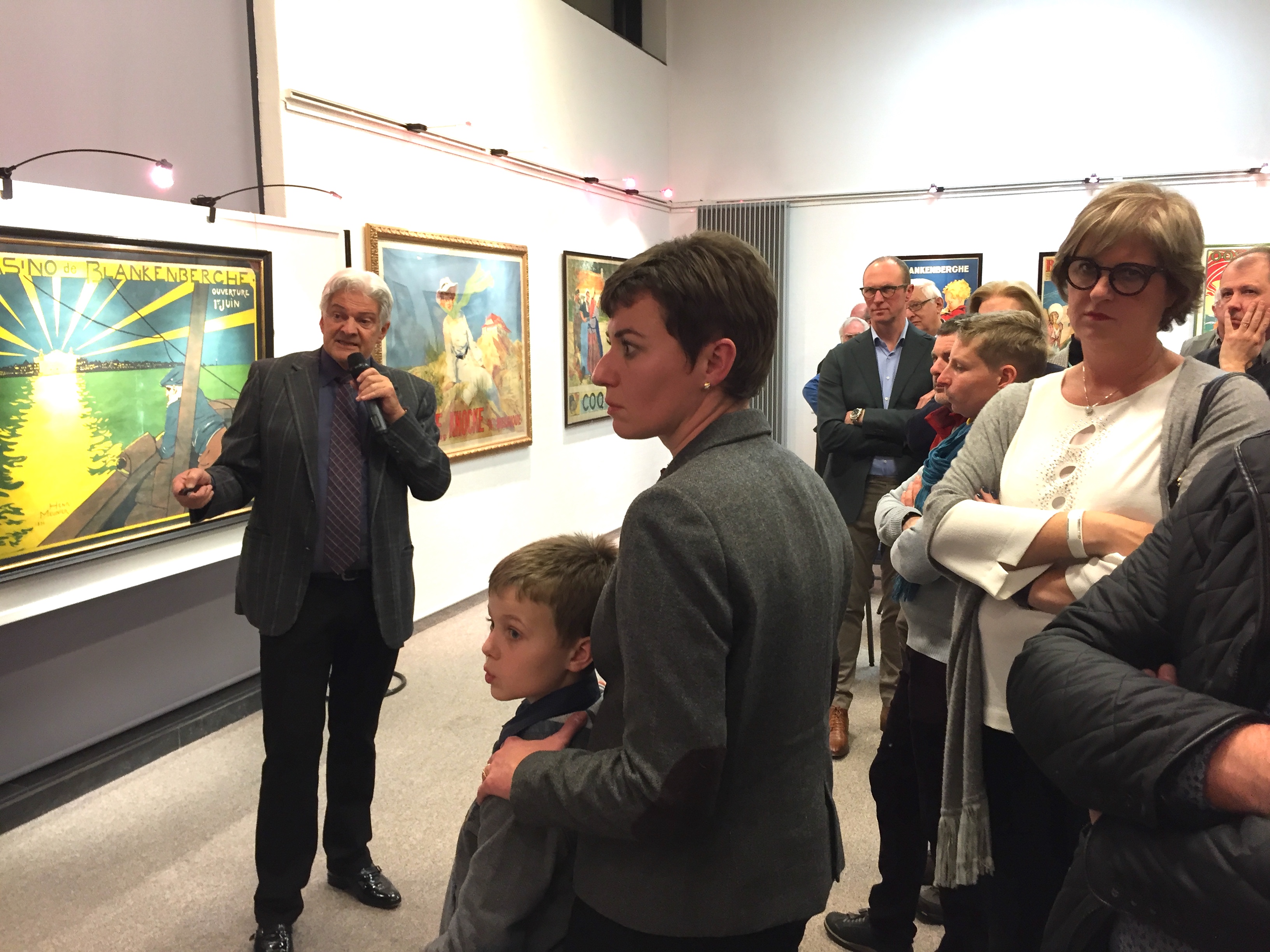 De 30 tentoongestelde kustaffiches komen, elk voor de helft, uit de collecties van Roland Florizoone en dokter Frans Buyse. Roland Florizoone (zie foto hieronder) verzorgde de hoofdspeech nl. de historiek van het affiche-fenomeen. Hoe komt het dat hij begonnen is aan zijn uitgebreide collectie? Wie betaalde die publiciteit op de affiches? Internationale uitstraling? Huidige collectioneursmarkt? Waarom vrouwen, waarom mannen, waarom kinderen? (wel klein foutje in zijn toespraak. Op de befaamde affiche met die mooie dame juist achter zijn rug is het uitzonderlijk geen villa uit de verkaveling die we nu Dumontwijk  noemen maar “Villa Eddy” destijds ter hoogte van de Prins Albertlaan)img_8991