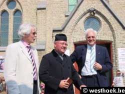 Toen het kinderkoor van Oostende zich opstelde om het duinenlied te zingen was er precies een blijkbaar onvoorziene verwarring in de organisatie. Inderdaad daar stond plots pastoorke Mervillie in levende lijve! Hij was voor de gelegenheid nedergedaald uit den hemel. “…Ehwel toen ik naar hier kwam heb ik nogal verschoten hoe het hier veranderd is in De Panne…. Al die gebouwen…Wat hebben gedaan met die mooie duinen… ” Wij hebben ook verschoten wat hij allemaal in zijn “calpingje” geschreven had over zijn vroegere bezoeken aan De Panne. ..Dit is allemaal uitgekomen tijdens zijn interview met Will Vansteene. Prachtig bedacht scenario en we hopen dat Willy dat “calpingje” gekregen heeft.
